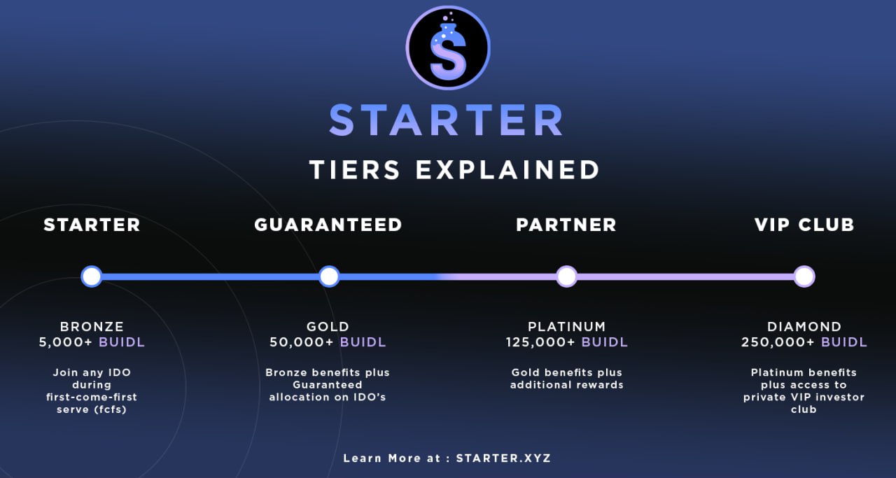 **IDO Participation:** Staking at least 5000 BUIDL tokens on the platform qualifies holders for **Starter Tier** status and allows them to participate in all approved presales on Starter. &#x20;