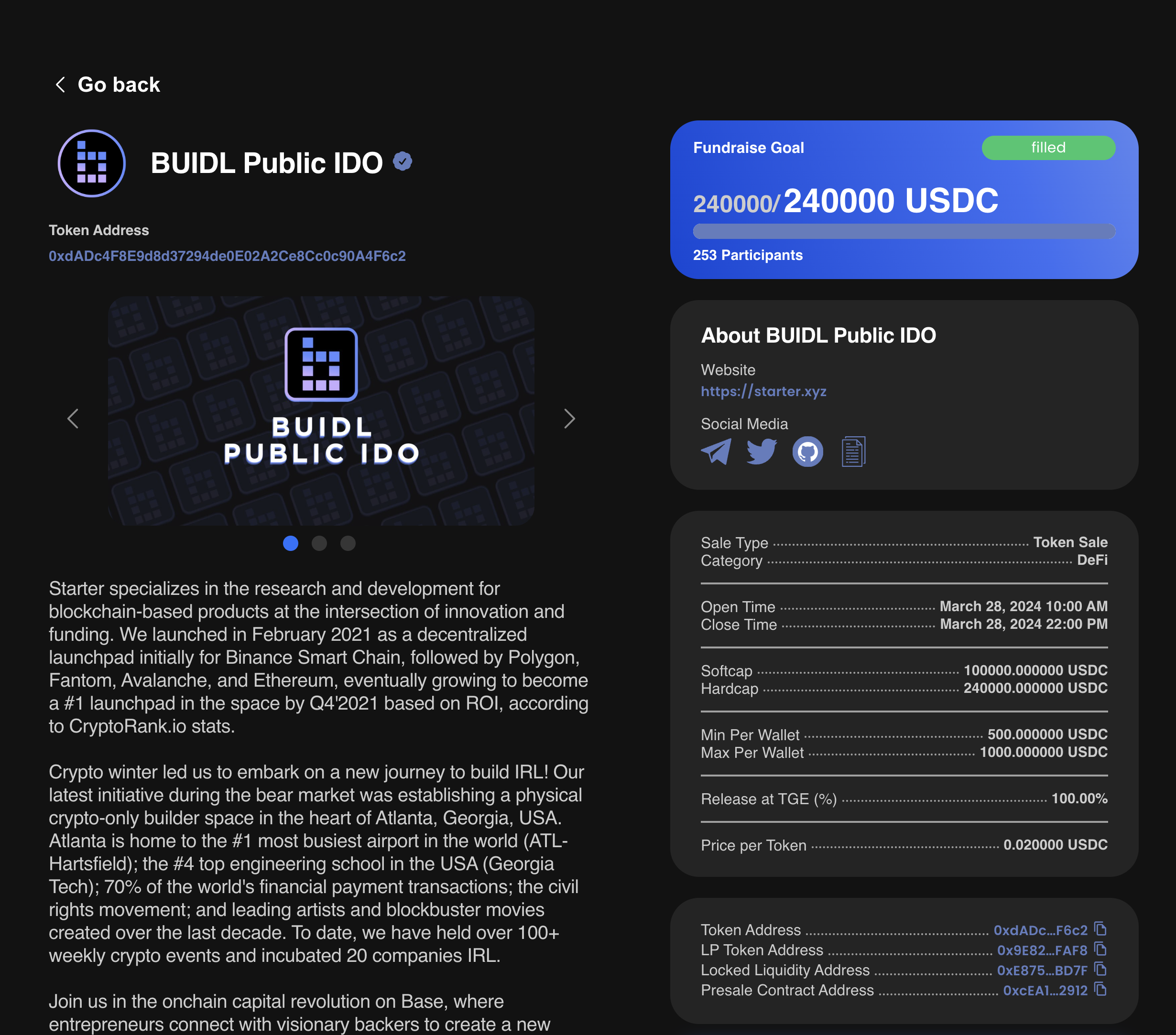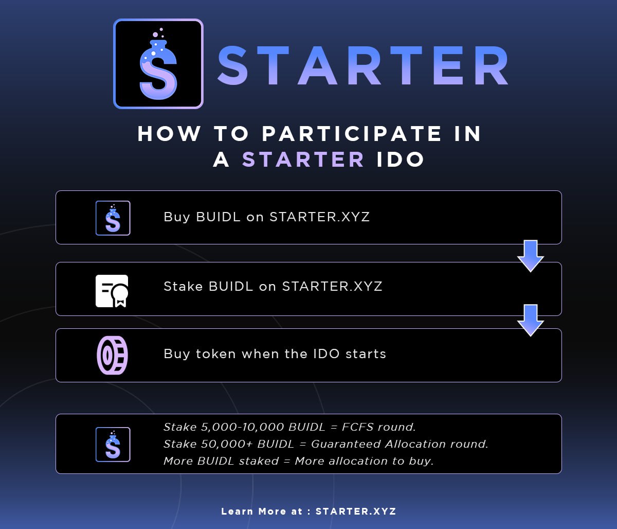 **Stake your BUIDL tokens on** [**starter.xyz**](https://starter.xyz) **to be eligible for the IDO:**&#x20;