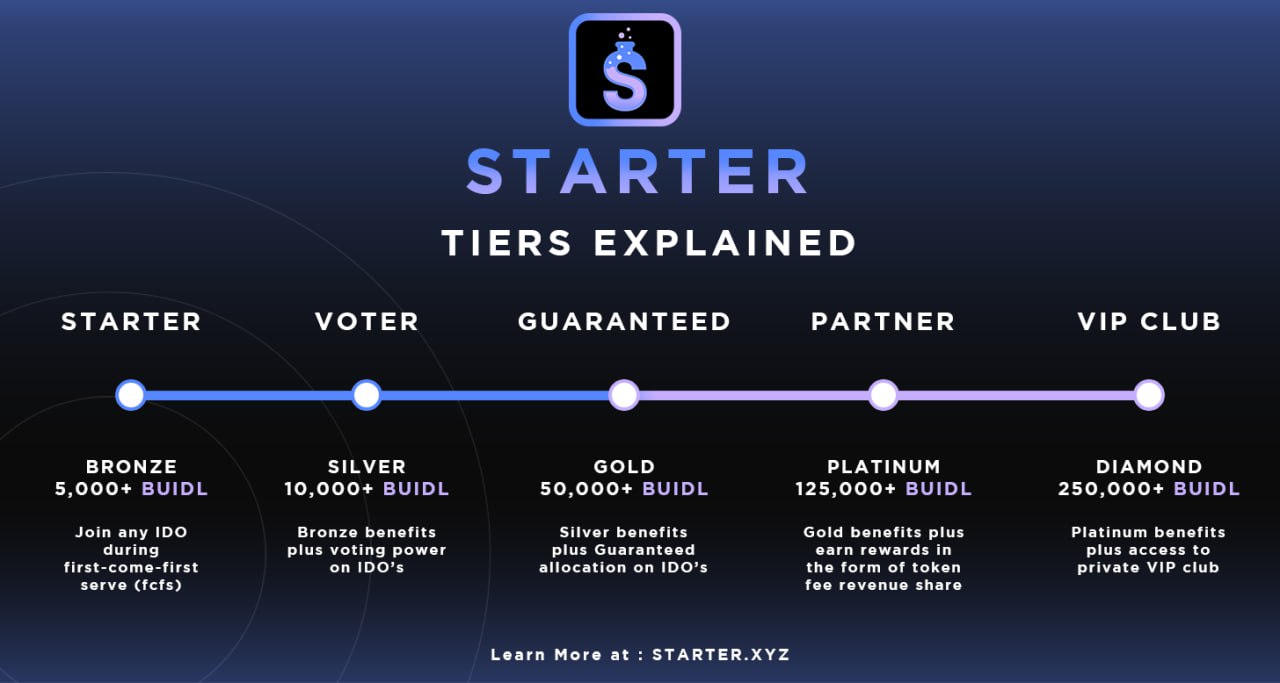 Once you have $BUIDL, you can stake them on the [Starter](https://starter.xyz) website and will be assigned to a tier based on the amount staked.